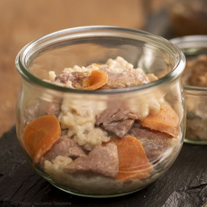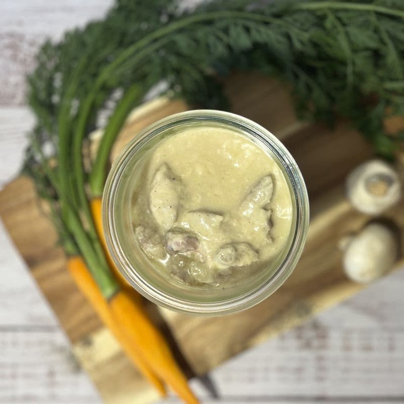 Riz de Camargue 40%, viande de volaille origine France 31%, crème UHT 35%MG 7% [crème (lait origine France), stabilisant (carraghénanes)], champignons de Paris, carottes, amidon de maïs, eau, arôme (contient céleri), sel, chicorée, poivre.