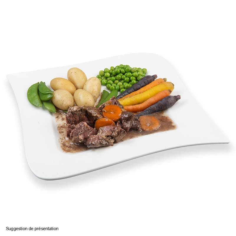 Viande de bœuf origine France 31%,eau, carottes, pomme de terre 28%, vin rouge 8% (contient sulfites), amidon de maïs, échalotes, arôme (contient gluten), sel, poivre.