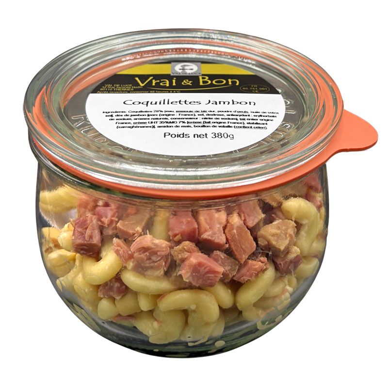 Coquillettes 28% [eau, semoule de blé dur, poudre d’oeufs, huile de colza, sel], dès de jambon [porc (origine : France), sel, dextrose, antioxydant : erythorbate de sodium, arômes naturels, conservateur : nitrite de sodium], lait entier origine France, crème UHT 35%MG 7% [crème (lait origine France), stabilisant (carraghénanes)], amidon de maïs, bouillon de volaille (contient céleri).