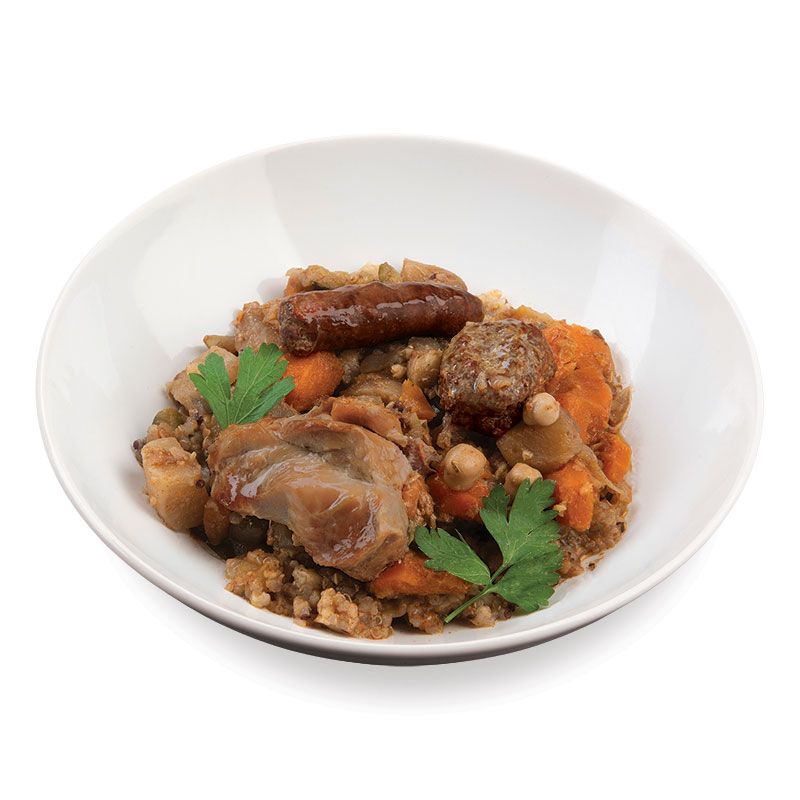 Eau, viande de volaille, viande de bœuf, merguez [viande de bovin, eau, boyau naturel: menu de mouton, épices, plantes aromatiques, dextrose, sel, acidifiants: E331, E330, aromes naturels, antioxygène: E301, colorants: E 120, E160C], carottes, courgettes, aubergines, navets, oignons, pois chiches, Quinoa 2,6% (blanc et rouge), blé dur précuit 2,6% (contient gluten), pulpe de tomate, arôme (contient céleri), épices, sel, poivre.