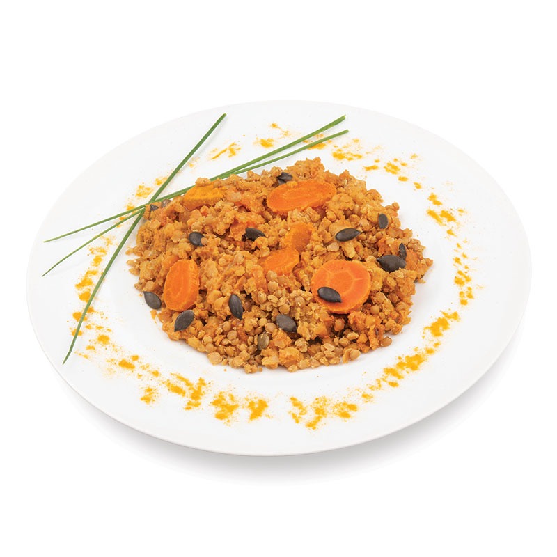 Lentilles Vertes 34%, carottes, pulpe de tomate, lait de coco [Extrait de noix de coco 60%, eau], eau, oignons, graines de courges 3,9%, huile de tournesol, curry, arôme.