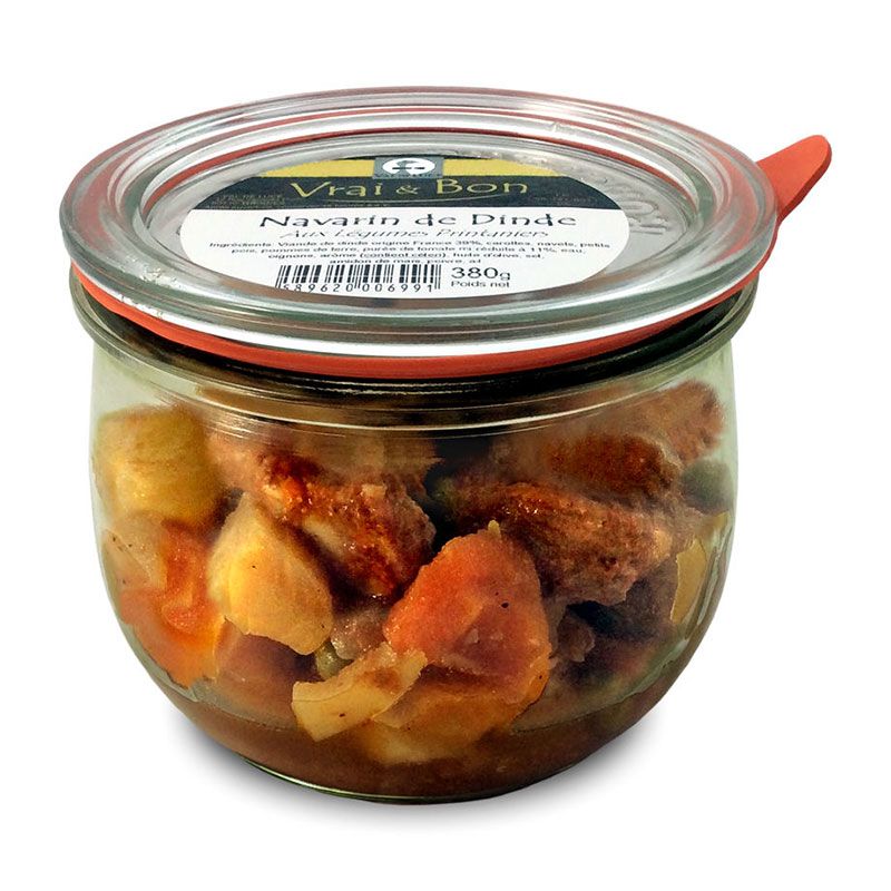 Viande de volaille origine France 39%, carottes, navets, petits pois, pommes de terre [pomme de terre, disulfite de sodium (E222: antioxydant)], pulpe de tomate, eau, oignons, arôme (contient céleri), huile d’olive, sel, amidon de maïs, poivre, ail.