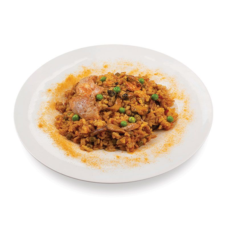 Riz, viande de volaille origine France, eau, petits pois, merguez 6% [viande de bovin, eau, boyau naturel: menu de mouton, épices, plantes aromatiques, dextrose, sel, acidifiants: E331, E330, aromes naturels, antioxygène: E301, colorants: E 120, E160C], poivrons, moules du Pacifique décortiquées 5%, anneaux d’encornets 5%, pulpe de tomate, crevettes tropicales décortiquées 3 %, chair de berlingot de mer 3%, huile de tournesol, arôme (contient céleri), curcuma, sel, paprika, piment, poivre blanc.