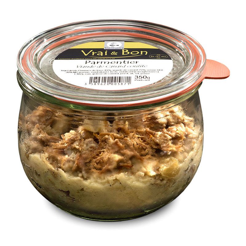 Pommes de terre 49% [pomme de terre, disulfite de sodium (E222: antioxydant)], viande de canard origine France 20%, oignons, crème UHT 35% MG [crème (lait origine France), stabilisant (carraghénanes)], lait entier origine France, graisse de canard, sel, ail, persil, poivre, thym, laurier.