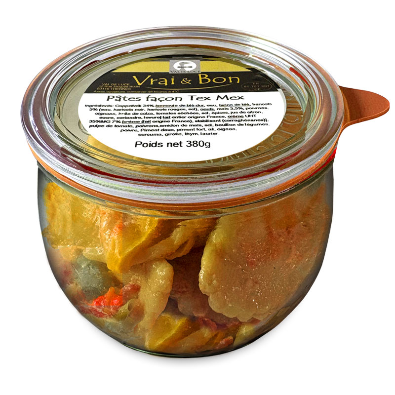 Cappelletti 34% [semoule de blé dur, eau, farine de blé, haricots 5% (eau, haricots noir, haricots rouges, sel), œufs, maïs 3,5%, poivrons, oignons, huile de colza, tomates séchées, sel, épices, jus de citron, sucre, coriandre, levure] lait entier origine France, crème UHT 35%MG 7% [crème (lait origine France), stabilisant (carraghénanes)], pulpe de tomate, poivrons, amidon de maïs, sel, bouillon de légumes, poivre, Piment doux, piment fort, ail, oignon, curcuma, girofle, thym, laurier.