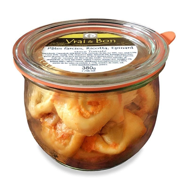 Cappelletti 34% [pâte 55%: Semoule de blé dur 39%, eau, œuf 5,5%. Farce 45% : ricotta 12%, chapelure (blé), épinards 9%, fromage blanc frais, flocon de pomme de terre (pommes de terre déshydratées, extrait d’épices), huile de tournesol, sel, fibre de blé, basilic, arômes naturels, ail déshydraté, poivre], lait entier origine France, crème UHT 35%MG 7% [crème (lait origine France), stabilisant (carraghénanes)], pulpe de tomate, amidon de maïs, sel, arôme (contient céleri), poivre