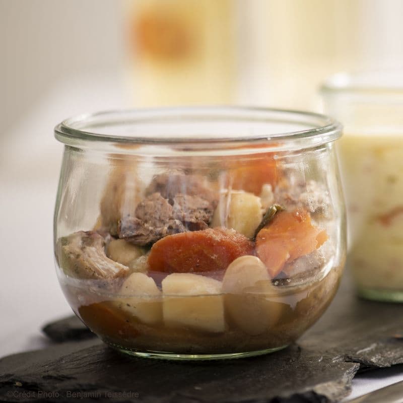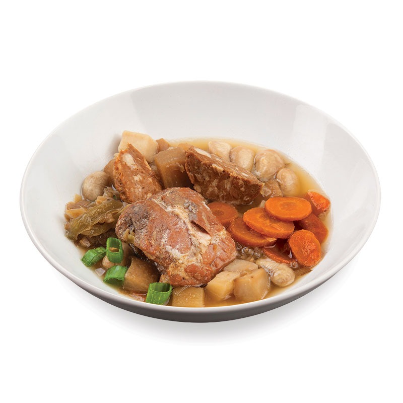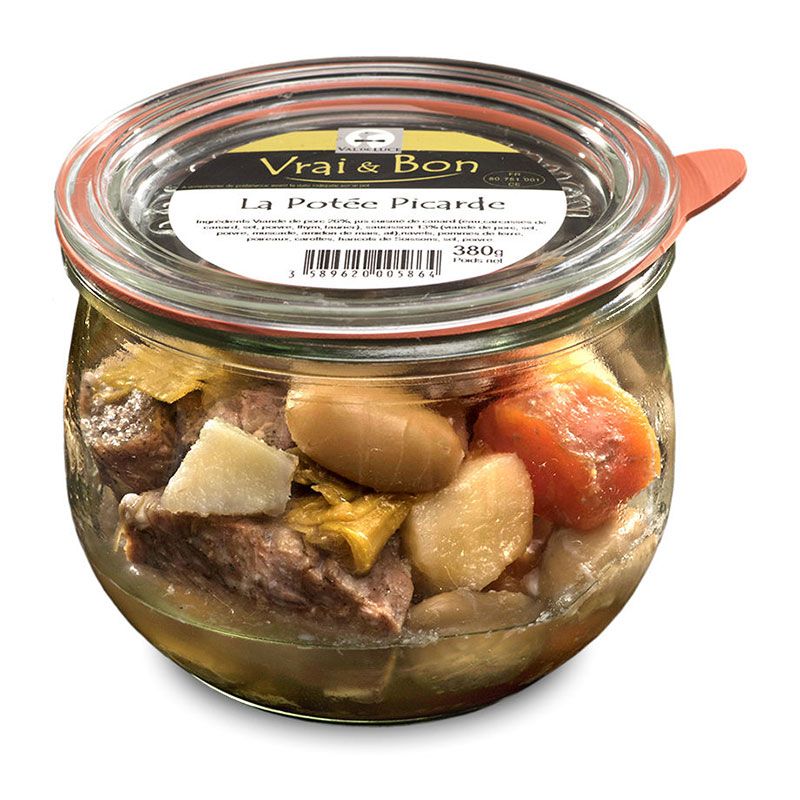 Viande de porc origine France 26%, bouillon [eau, arôme (contient céleri)], saucisson 13% [viande de porc origine France, sel, poivre, muscade, amidon de maïs, ail], navets, pommes de terre [pomme de terre, disulfite de sodium (E222: antioxydant)], poireaux, carottes, haricots de Soissons, sel, poivre gris.