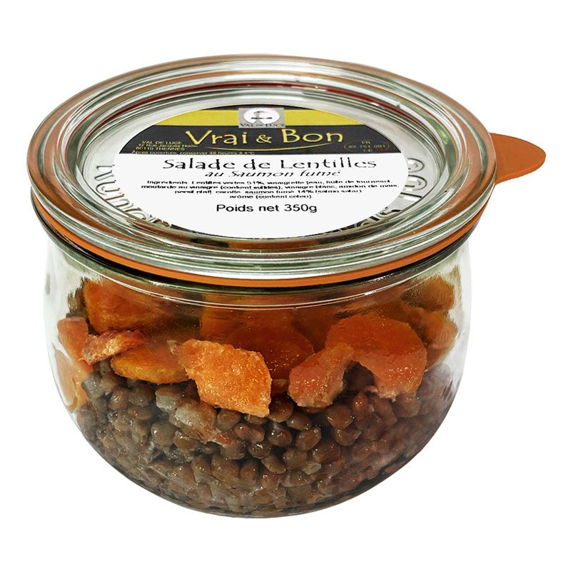 Lentilles vertes 51%, vinaigrette [eau, huile de tournesol, moutarde au vinaigre (contient sulfites), vinaigre blanc, amidon de mais, persil plat], carotte, saumon fumé 14% (salmo salar), arôme (contient céleri).