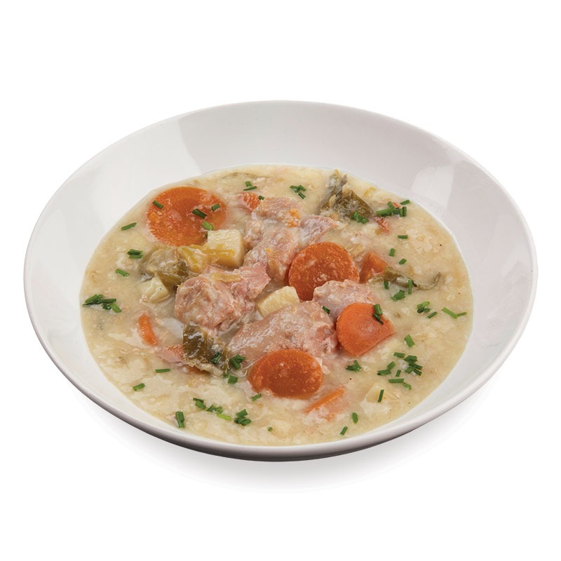 Viande de volaille origine France 31%, eau, pommes de terre, carottes, crème UHT 35%MG 7% [crème (lait origine France), stabilisant (carraghénanes)], poireaux, amidon de maïs, arôme (contient céleri), sel, poivre, curcuma.